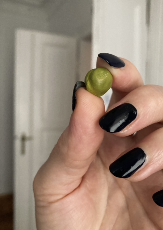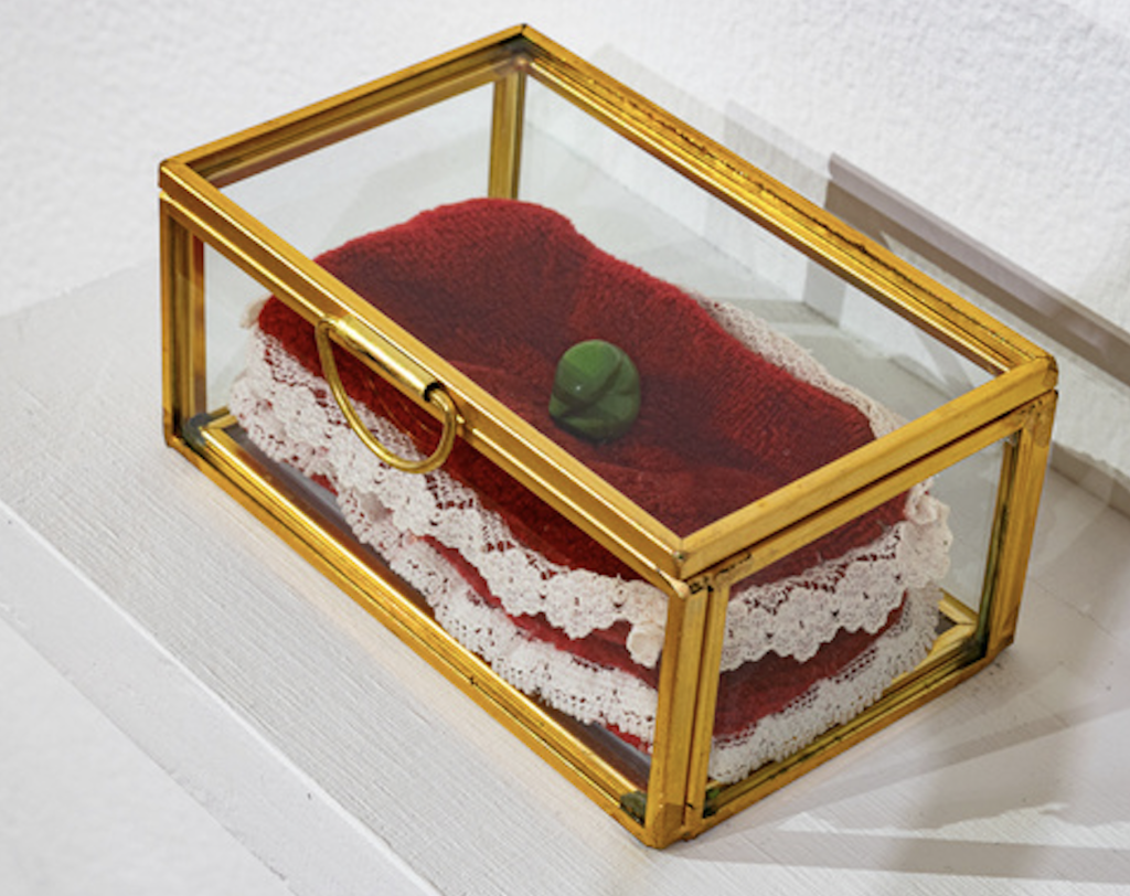 Clay, enamel, velvet, and lace, glass box with gold frame, 1.5 x 3.5 x 2.5 in