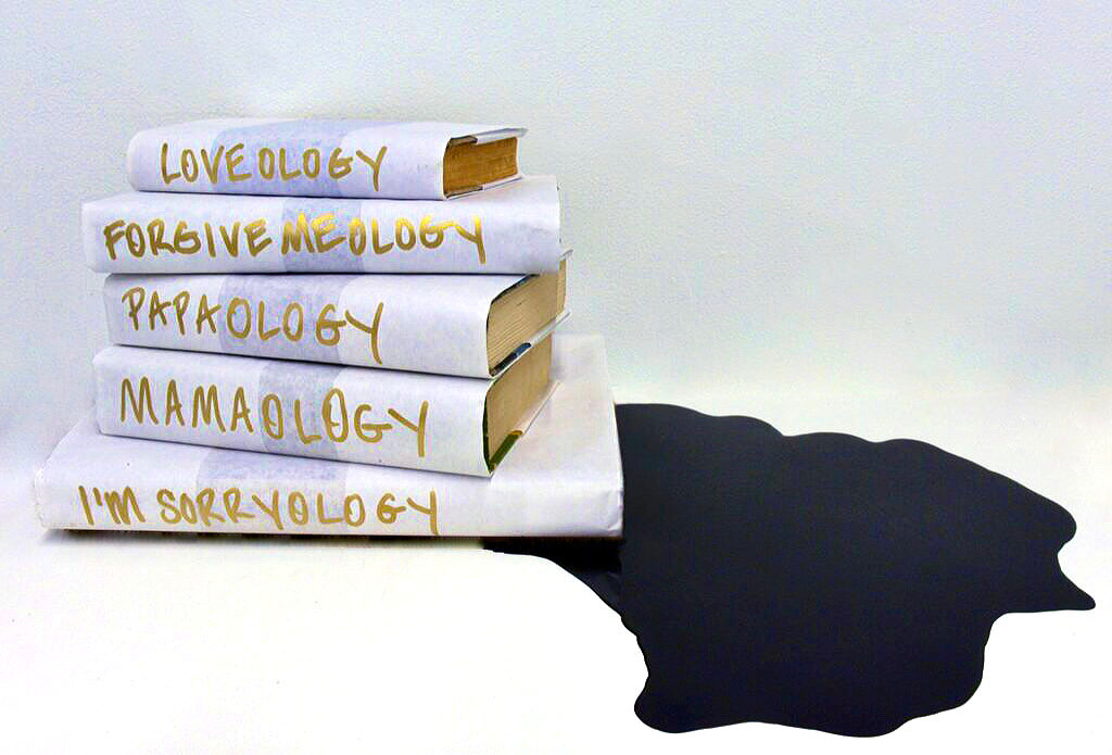 Tar, enamel, craft paper, books: (top to bottom – Fairy Tales and Stories by Hans Christian Anderson, The Age of the Crisis of Man: Thought and Fiction in America 1933-1973 by Mark Greif, Hemingway‘s For Whom the Bell Tolls, Homer’s Iliad, Silent Partners: Artist and Mannequin from Function to Fetish by Jane Munro)